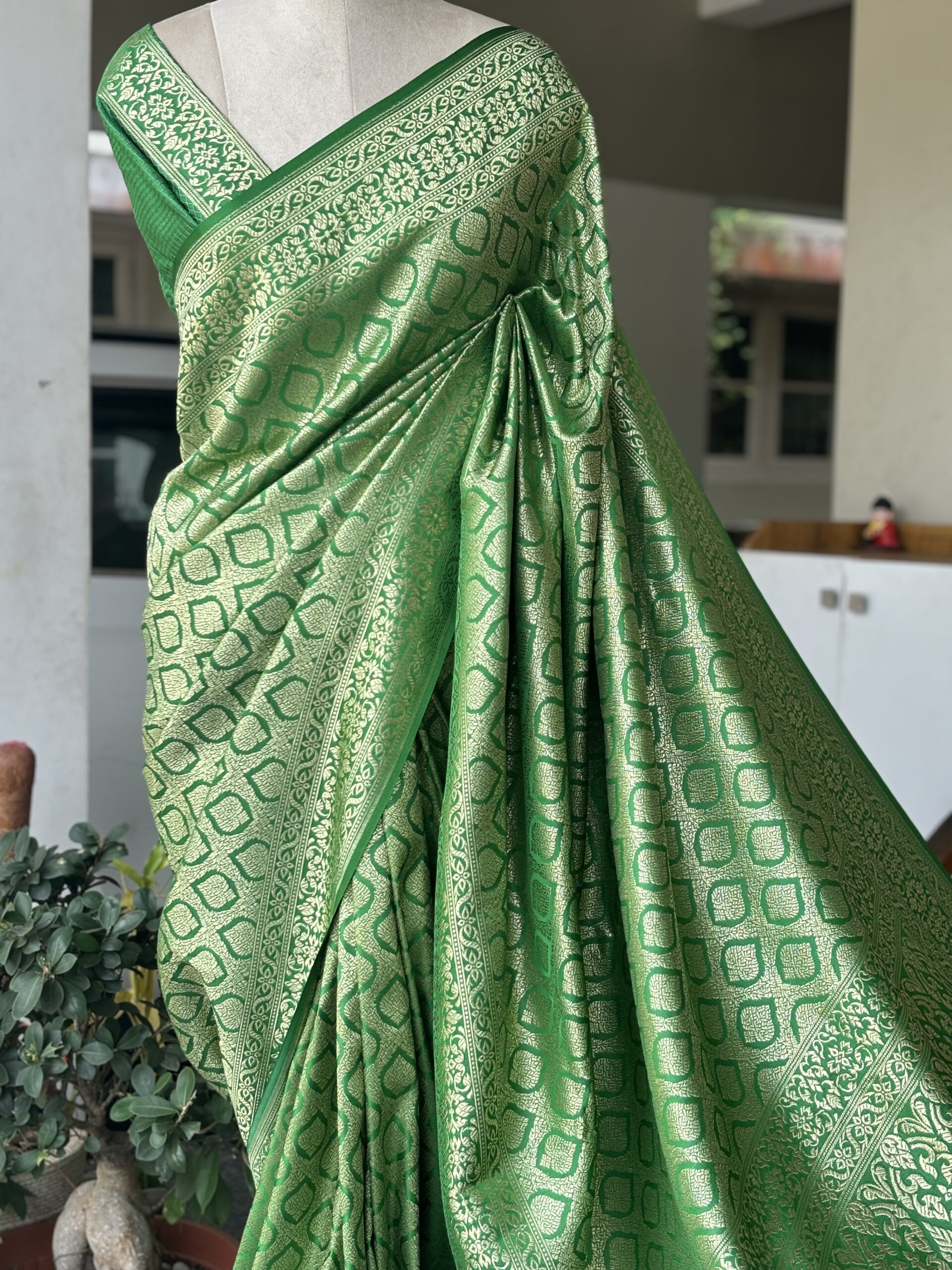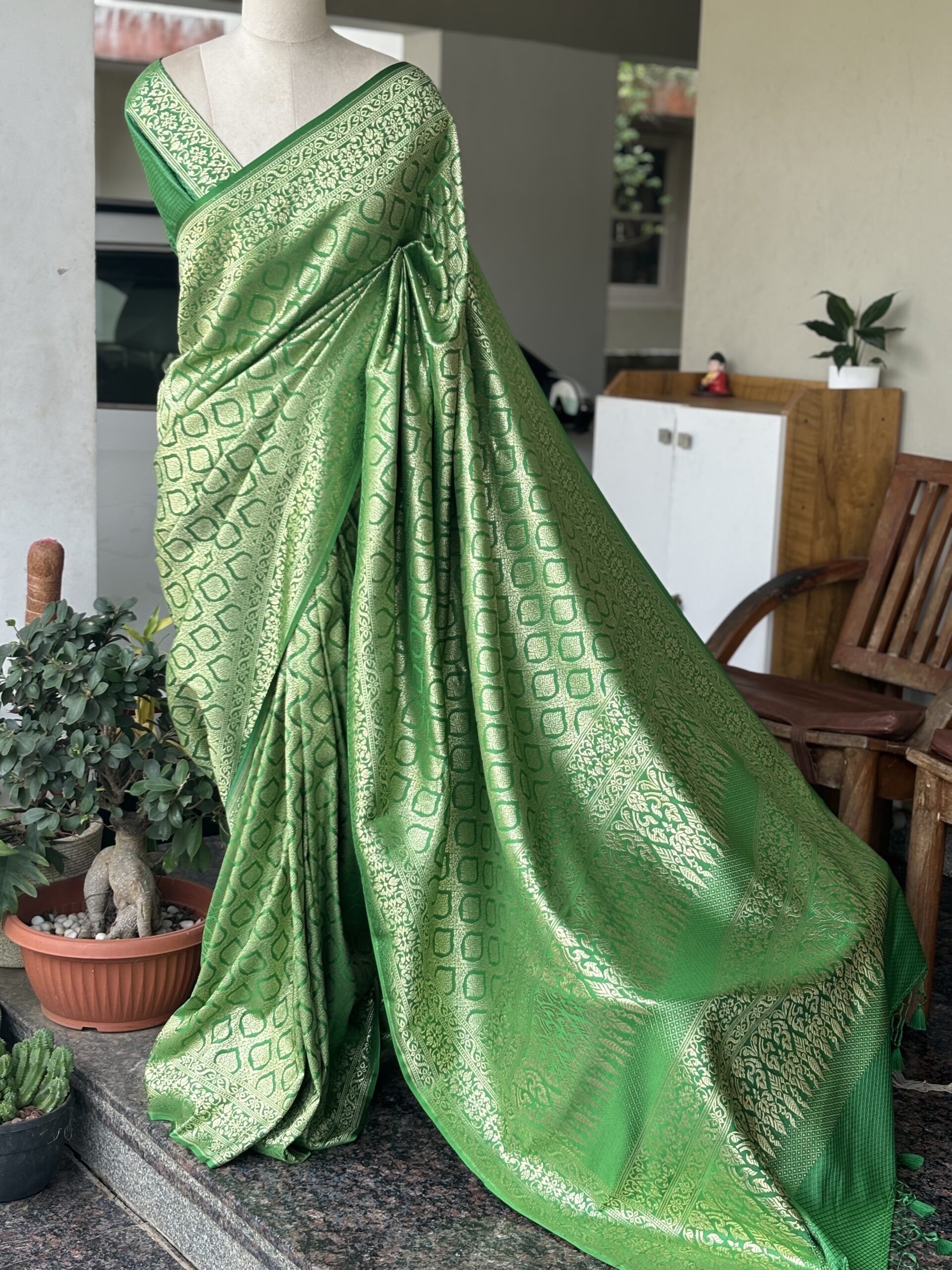 Draped in elegance,this parrot green katan silk saree beautifully blends tradition with sophistication.woven with intricate gold zari work,the saree radiates a timeless charam perfect for festive occasions,wedding,and celebration. The saree comes with a plain silk blouse highlighted by a matching zari border. Pre booking: 15 days