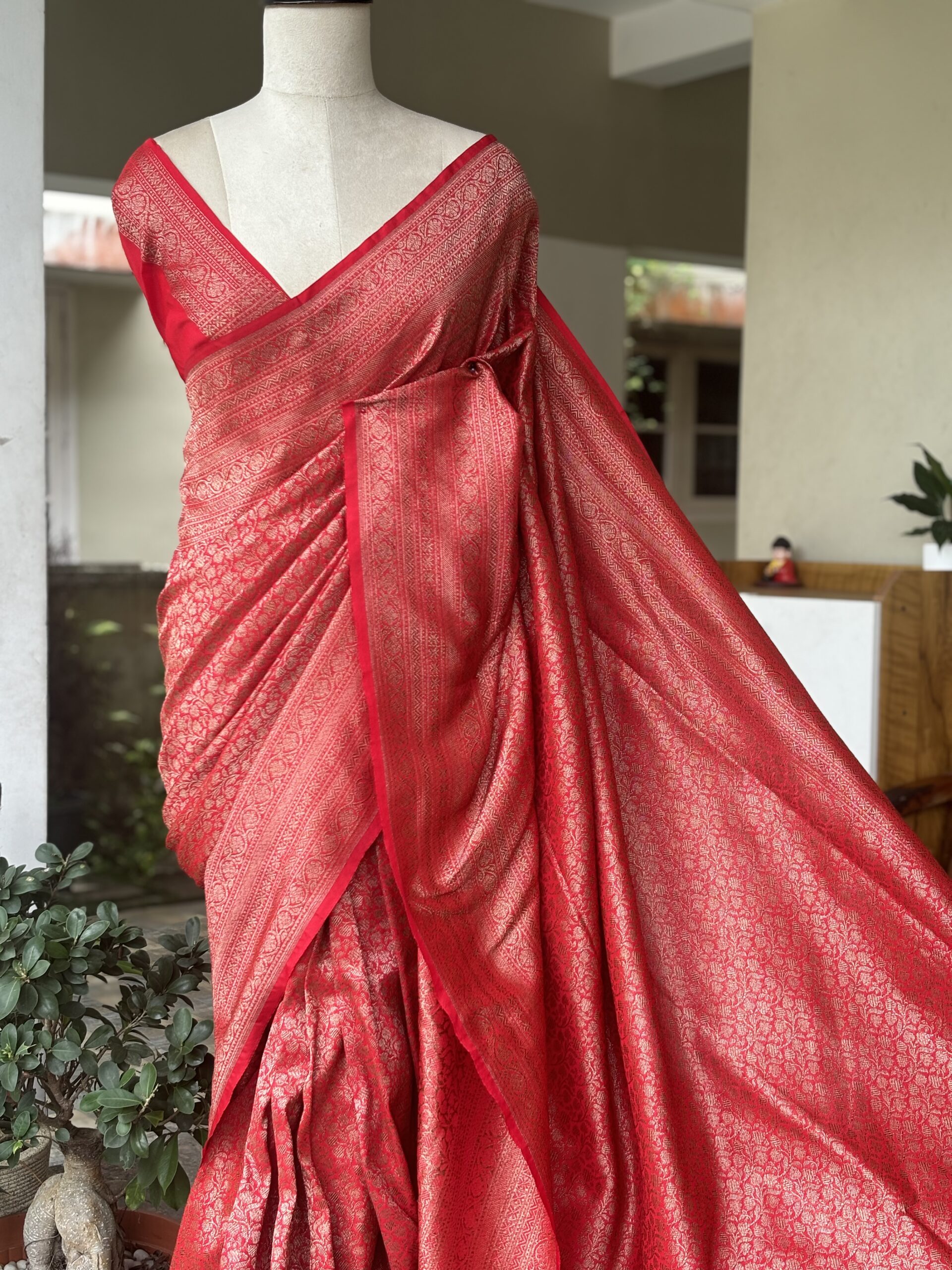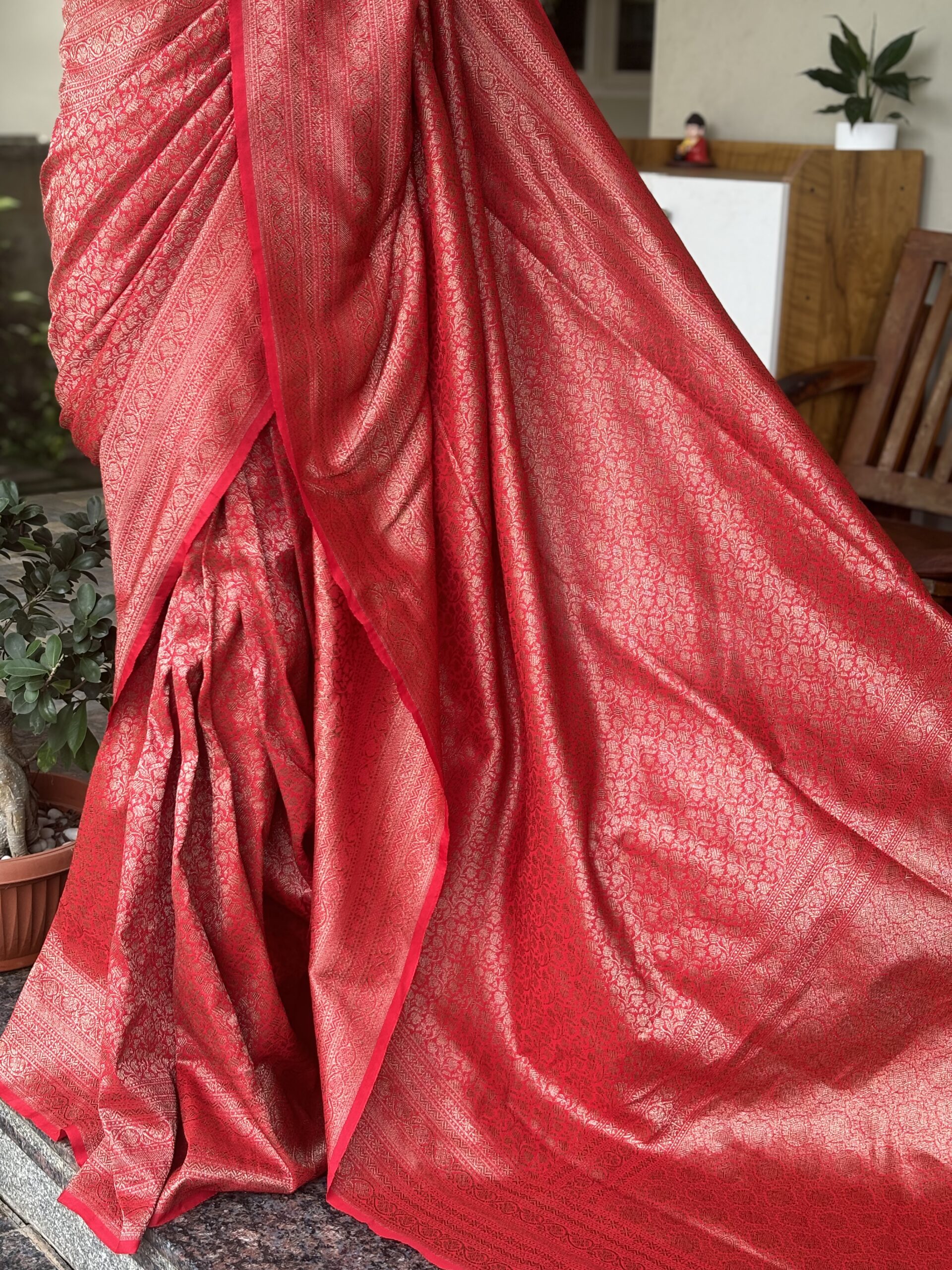 Featherlight drapes, timeless elegance ✨ Draped in our stunning tomato red Banarasi Silk Saree with antique gold brocade — perfect for your special moments like weddings & baptisms. Easy to wear, harder to forget!
